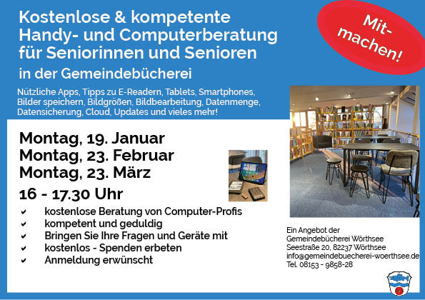 Unsere Bücherei ist ein WOHLFÜHLORT, ein Ort der Medienausleihe, ein kultureller Treffpunkt. Wir haben auch gemütliche Sitzecken, außerdem herrscht bei uns eine besonders nette Atmosphäre und Sie haben einen tollen Blick auf den Wörthsee.